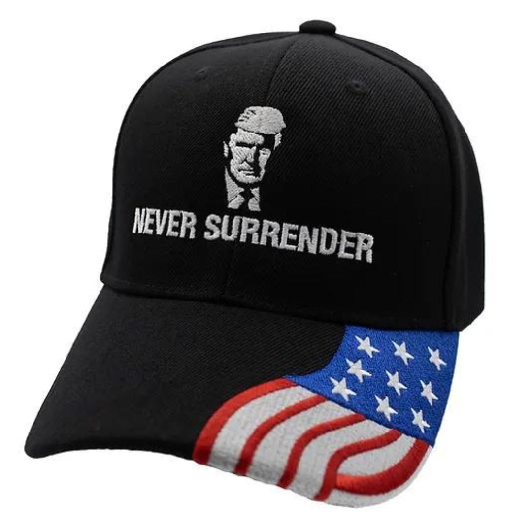 Trump Mugshot Never Surrender Embroidered Hat w/Flag Bill (Black)